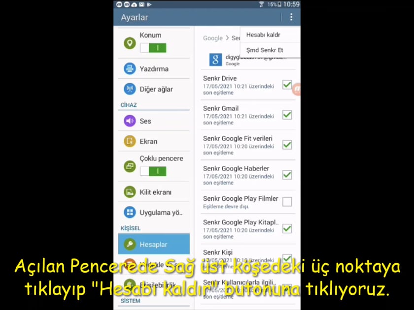 Ayarlar Sayfasından Hesaplar Ardından Sağ Kısımda Açılan Google Sekmesine Tıklıyoruz.